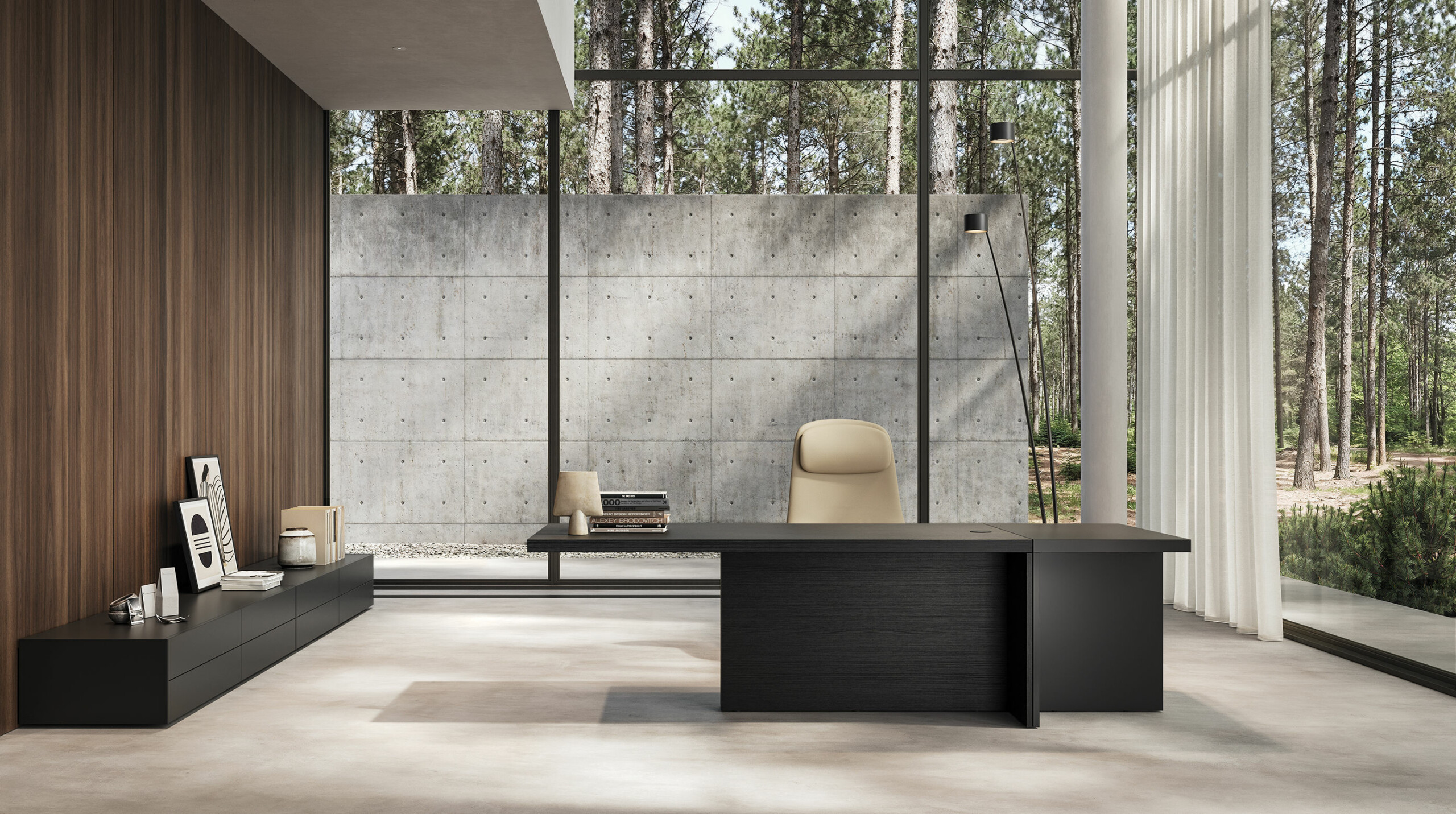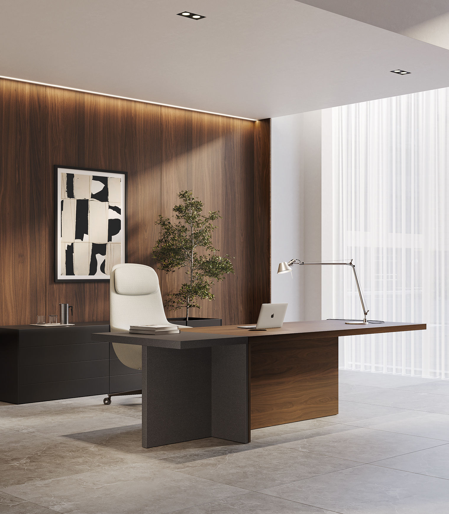 Ce bureau directionnel est né de l’union de deux éléments distincts qui, placés côte à côte, forment idéalement un T. Ces éléments jouent un rôle important dans les combinaisons de couleurs et les finitions, permettant une créativité maximale dans la combinaison des couleurs et des matériaux, allant des bois raffinés et des laques mates aux cuirs et matériaux fins tels que le Fenix et Oleomalta.