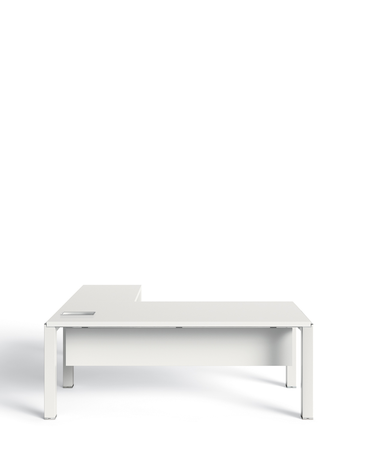 Le bureau Spike est disponible avec un plateau en verre, mais peut également être configuré en mélamine, HPL ou bois, avec ou sans plateau de retour, afin de s’adapter à tous les styles d’aménagement de bureaux de direction.