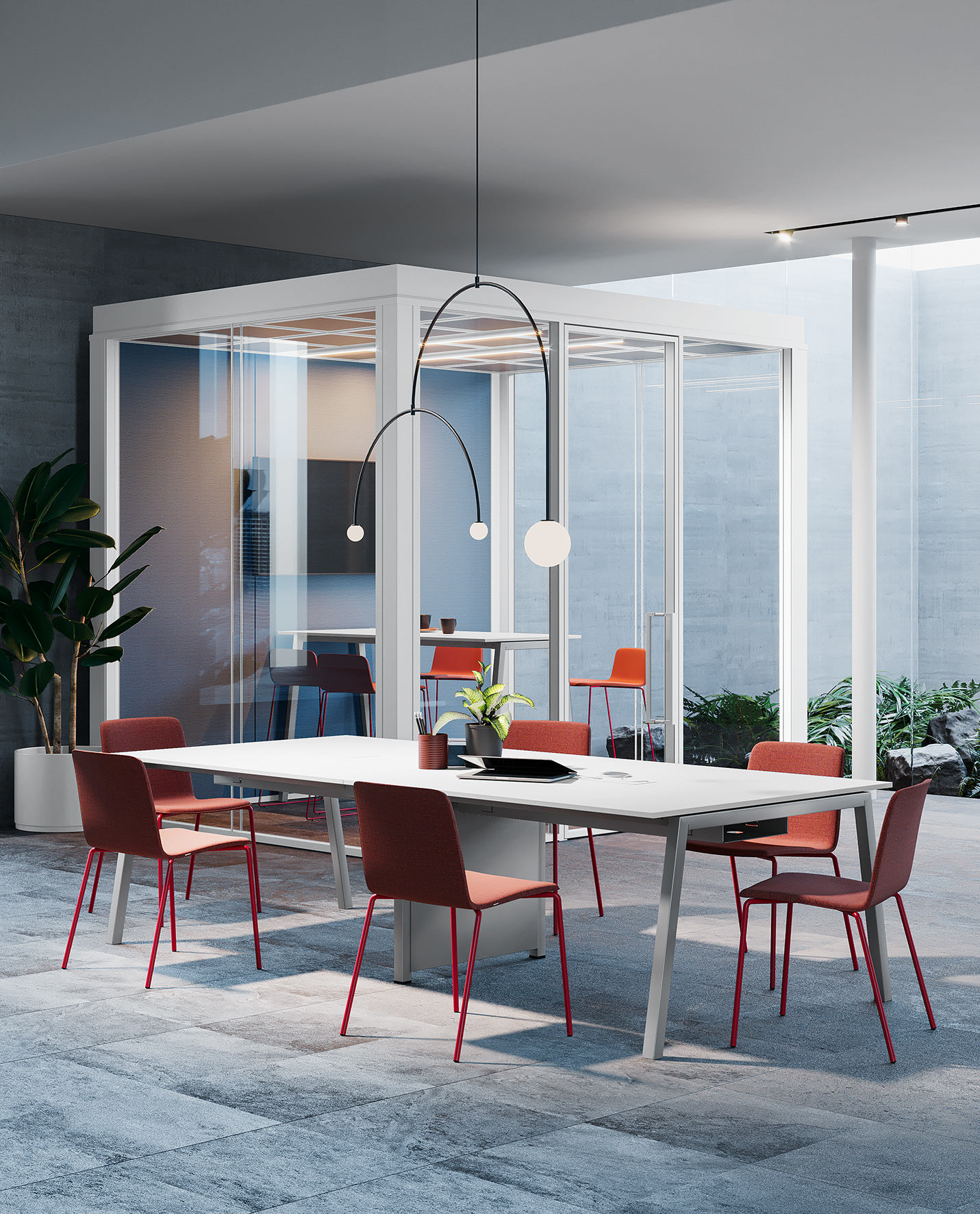 La collection Pop Ace inclut également des tables de réunion design et des bureaux multi-postes, permettant de créer des espaces de travail harmonieux, modulables et performants.